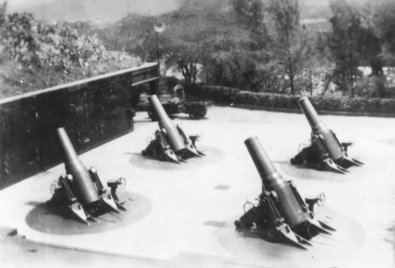 Looking across the gun pit at the deflector wall. The stairs in the middle go up to a narrow walk way which goes to stairs that run up either side of the blast deflector.