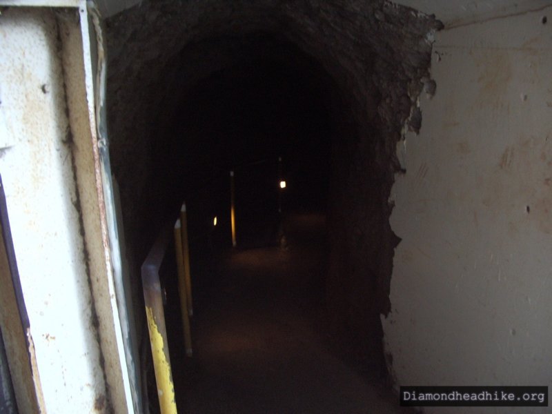 Near the end of the tunnel it curves to the left. Because of that, as you climb the slope through the tunnel there's no light ahead of you until you get very near the end. When you come out of the tunnel there's another set of stairs on the right, and an opening on the left that takes you out to an overlook. Most people look to the right, express their opinion and go to the left. The square mark that you see on the wall ahead is a covered up opening into a room built in the far wall of the stairs.