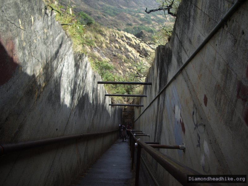 Looking down the stairs. The tunnel opening is in the wall at the bottom left. That's a drain running down the right side. The pipe on the left is conduit for electrical wires, phone lines, etc., the one on the bottom right was for water, and the top left is probably electrical.
