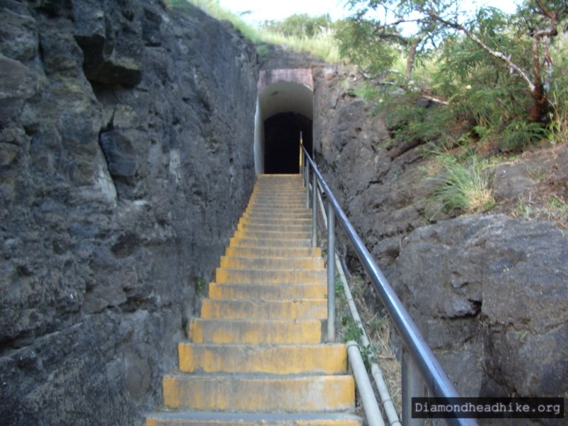 From the bottom of the stairs, the landing is the wide spot in the center of the photo, the notch with the sunlight in it is the opening to the winch landing.