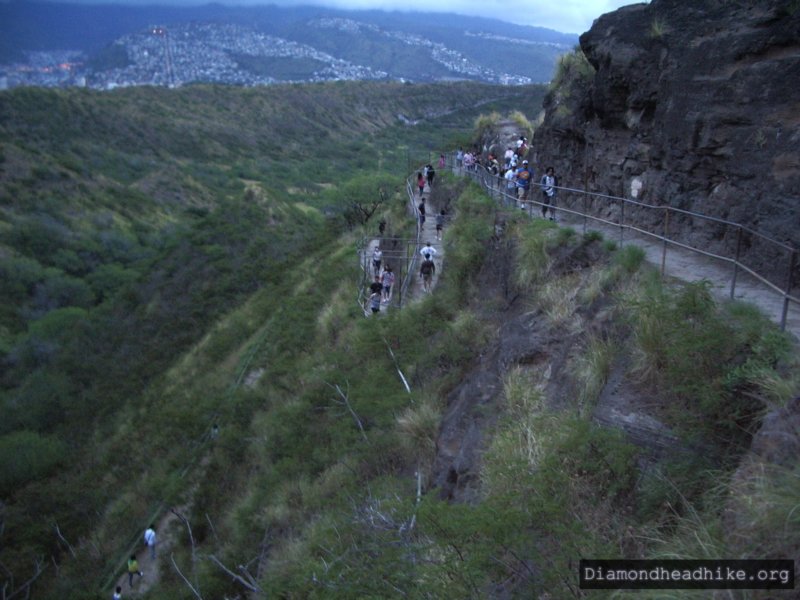 The corner ahead of the woman in the blue sweater is where the last picture was taken from. You can see the first set of stairs in the middle of the picture, and above and to the left is the top of the next set, with the observation point above that. The horizontal bars over the trail were for hanging camouflage netting.