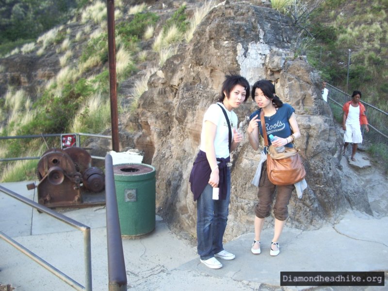 This was taken from the platform at the bottom of the first set of stairs. The light section on the right is the notch into the winch platform, and you can get a good view of the trail coming up to it. This section is about average width, just wide enough to pass someone. There's just a glimpse of a section of trail on the other side of the valley at the very left edge of the photo. The first section beyond the concrete path is in the trees at the bottom, wrapping around left side of the hill that the sun is just starting to hit.